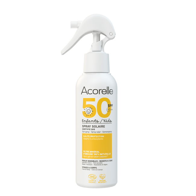 Le Spray Solaire Bio Enfants SPF50 de la marque Acorelle offre une protection solaire haute performance, sans parfum, spécialement formulée pour le visage et le corps.