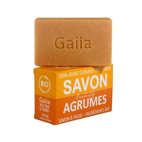 Le Savon Savon Surgras l'Intuitif de la marque Gaiia est enrichi en 4 huiles végétales (huiles d’olive, de son de riz, de coco et de ricin). C'est un véritable soin lavant car il contient de la glycérine hydratante (8,5 %) qui respecte la peau. Testé sous contrôle dermatologique, ce savon est idéal pour le visage et le corps de toute la famille. Il peut aussi être utilisé pour la barbe et les cheveux. Laissez-vous porter par son parfum fruité et stimulant à base d’huiles essentielles de pamplemousse, d’orange, de citron vert, de néroli, de bergamote et de gingembre.