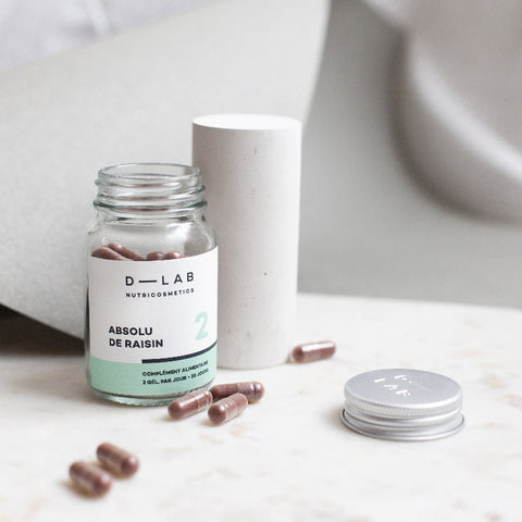 Absolu de Raisin est un complément alimentaire de la marque D-Lab destiné à freiner l'apparition des premières rides et le vieillissement cutané en général.