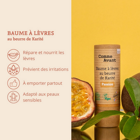Le Baume à lèvres au Beurre de Karité de la marque Comme Avant est un soin adapté à toute la famille dès 3 ans. Sa formule 100 % d’origine naturelle et 100 % bio prend soin des lèvres sèches ou abîmées, tout en respectant votre peau et la planète.
