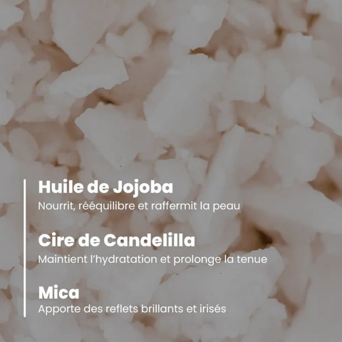 Mica et pigments minéraux : apportent un éclat lumineux au teint grâce à leur fini satiné, tout en assurant une couleur intense et naturelle, modulable selon l’application.