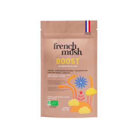 La Boisson Boost de la marque French Mush est une boisson 100 % végétale, sans sucre, sans gluten et sans additifs, pensée pour une stimulation douce, stable et sans nervosité.