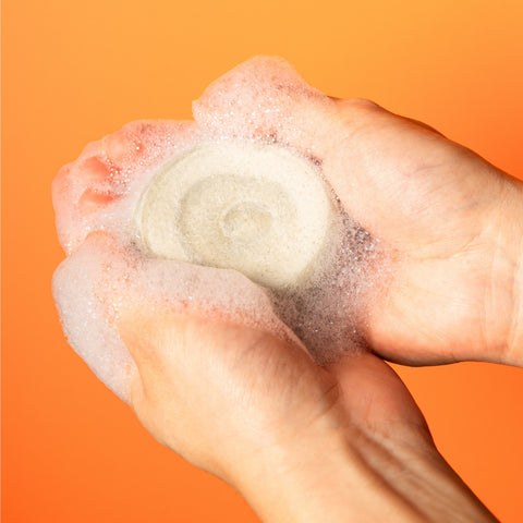 Humidifier le galet, faire mousser directement sur le cuir chevelu, masser puis rincer. À utiliser 2 à 3 fois par semaine ou dès que les racines ont besoin d’un coup de frais.