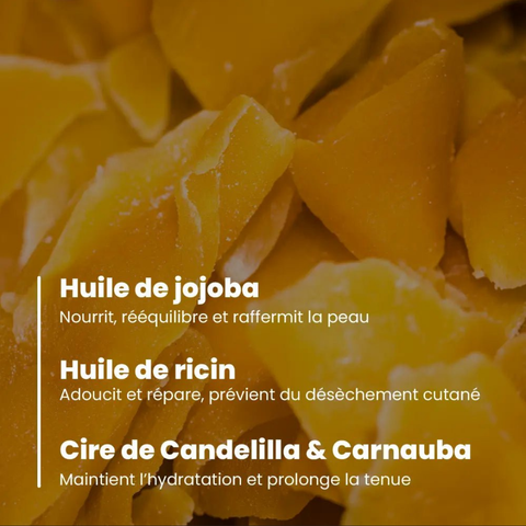Cires de carnauba et de candelilla : ces cires végétales créent une texture fondante et facile à travailler, garantissant une application fluide, une tenue longue durée et une peau protégée de la déshydratation.