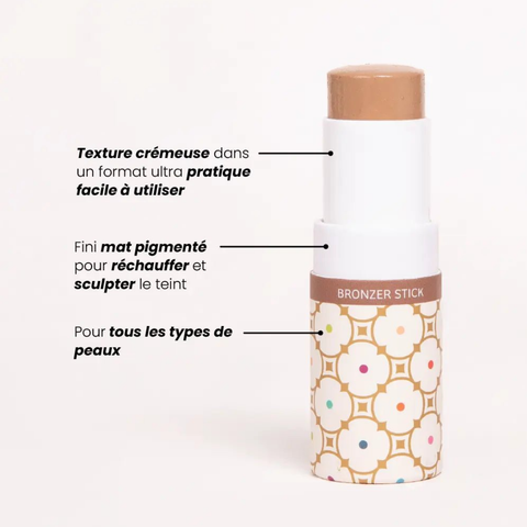 Le Bronzer Stick de la marque Charlotte Bio présente une texture crémeuse et pigmentée qui glisse facilement sur la peau et offre une intensité modulable, parfaite pour un contouring précis ou un effet soleil diffus. Sa forme stick nomade permet une application pratique, où que vous soyez.