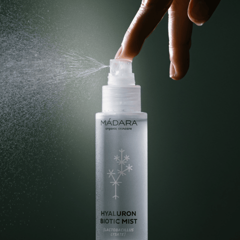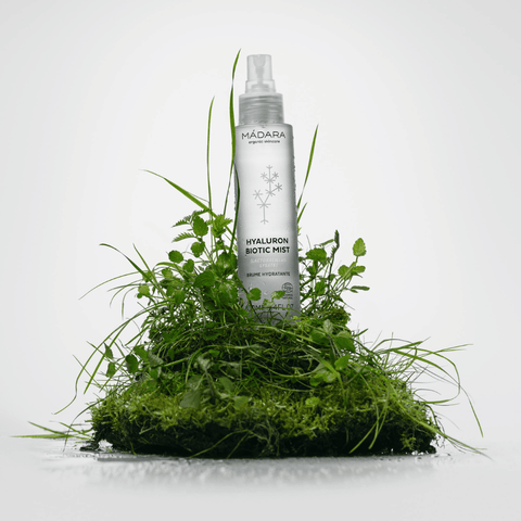Certifiée COSMOS Natural et Vegan, la Brume Biotique à l’Acide Hyaluronique de la marque Mádara s’inscrit dans une démarche écoresponsable avec son packaging recyclable.