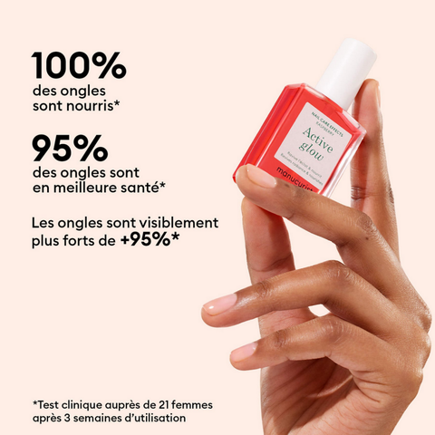 Limez vos ongles avec la Mini Lime Premium, appliquez le vernis soin Active™ Glow Raspberry sur ongles nus pour un éclat modulable, puis massez la Mini Huile Verte sur cuticules et contours.