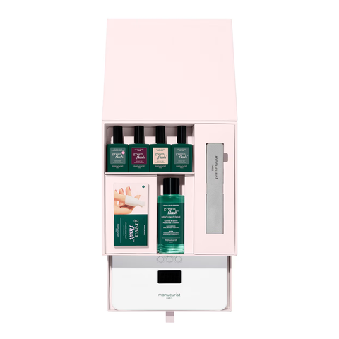 Le Coffret Cadeau Green Flash™ de la marque Manucurist présente une routine manucure semi-permanente complète et naturelle pour des ongles forts, brillants et impeccables jusqu’à 12 jours.