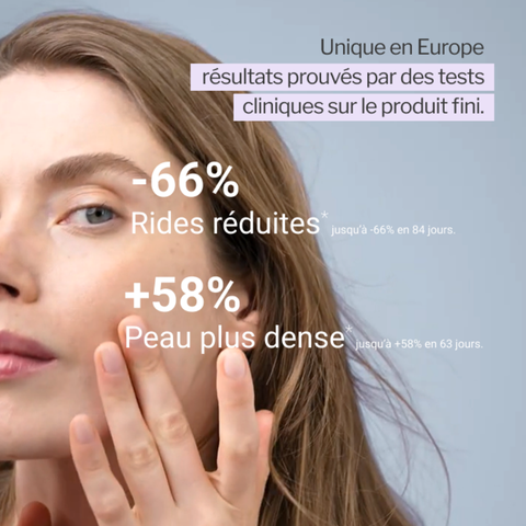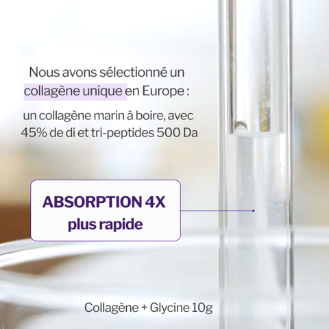 Sa formule unique associe 5 g de peptides de collagène marin hydrolysé (500 Da, 45 % di- & tri-peptides) à 5 g de glycine pure, des vitamines (C, B3, B5, B8, B9, E), du zinc, du MSM et 120 mg d’acide hyaluronique pour une action anti-âge complète : +58 % de densité cutanée, -66 % de rides, et peau plus ferme en 84 jours*, selon des tests cliniques sur produit fini.