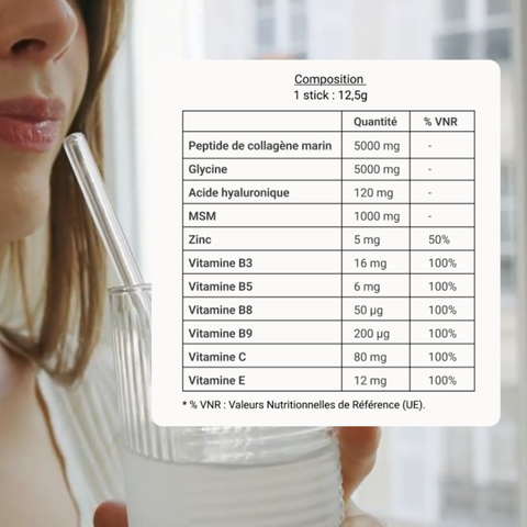 Glycine, peptides de collagène marin (poisson), méthylsulfonylméthane (MSM), arômes naturels, acide citrique (correcteur d’acidité), hyaluronate de sodium, vitamine C (L-ascorbate de calcium), vitamine E (acetate de D-alpha tocophéryle), bisglycinate de zinc, niacine (vitamine B3, nicotinamide), acide pantothénique (vitamine B5, D-pantothénate de calcium),5MTHF-glucosamine (vitamine B9), D-biotine (vitamine B8).