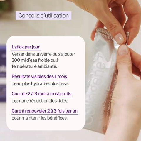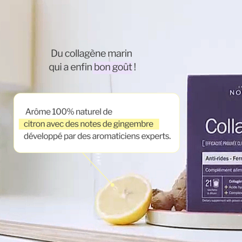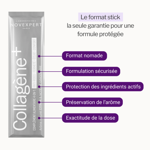 Le Complément Alimentaire Collagène + de la marque Novexpert présente un format stick nomade, qui garantit un dosage optimal, une hygiène parfaite et une conservation optimale des actifs. La poudre se dilue facilement, avec un arôme 100 % naturel de citron et notes de gingembre, sans sucres ni édulcorants, pour une expérience sensorielle agréable.