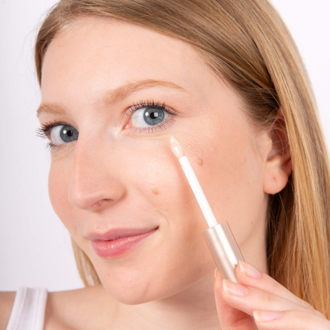 Applique une petite quantité de correcteur sous les yeux à l’aide de l’embout applicateur, puis estompe délicatement au doigt ou au pinceau pour un fini naturel et lumineux.
