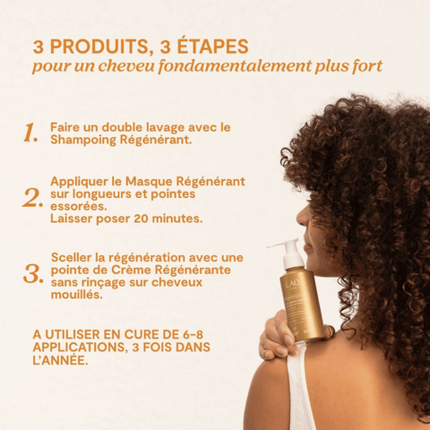 Pour des résultats optimaux, il est conseillé de combiner les trois soins complémentaires de la gamme : Shampoing Régénérant, Masque Régénérant, Crème Régénérante sans rinçage