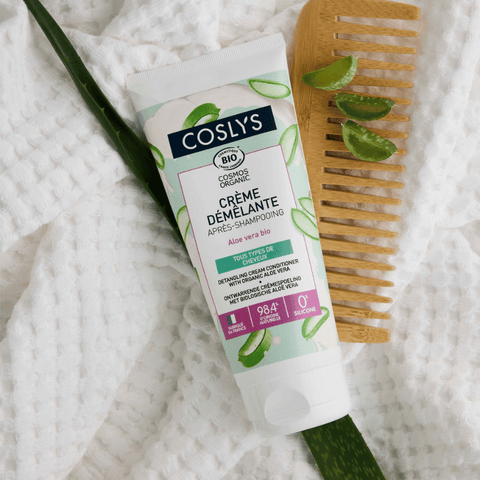 La Crème Démêlante Bio de Coslys hydrate, protège et nourrit les cheveux grâce à son mélange d'aloe vera bio et d'huile de coco bio. Elle démêle efficacement, rendant les cheveux doux et brillants. Composée à 98,4 % d'ingrédients naturels, elle est certifiée Cosmos Organic et Vegan. Fabriquée en France, son flacon est 100% recyclé et recyclable.