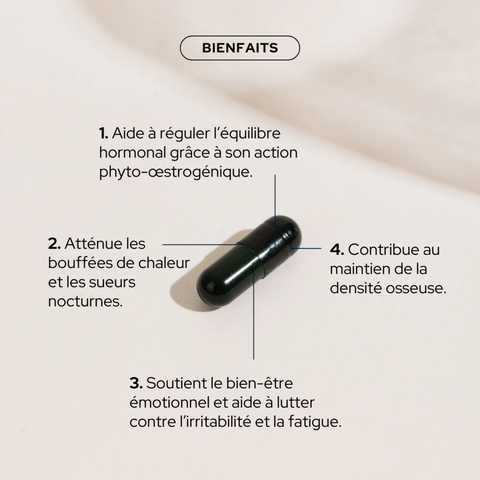 La formule repose sur des actifs sélectionnés. Lifenol™ , extrait breveté de houblon riche en phytoestrogènes, mime l'action des œstrogènes pour réduire l'intensité des symptômes liés à leur chute. Le Reishi , champignon adaptogène, agit sur l'équilibre nerveux et émotions afin d'aider à réduire la nervosité et la fatigue mentale. La vitamine D3 contribue au maintien d'une ossature normale et participe à limiter les inconforts articulaires en synergie avec le calcium.