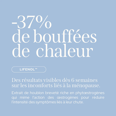 Extrait de houblon Lifenol™ : complexe phyto-œstrogénique agissant sur les désagréments liés à la chute hormonale, notamment bouffées de chaleur et sensations d’inconfort liées à la ménopause.