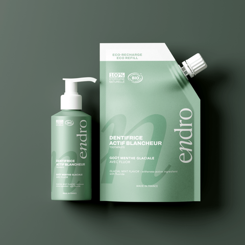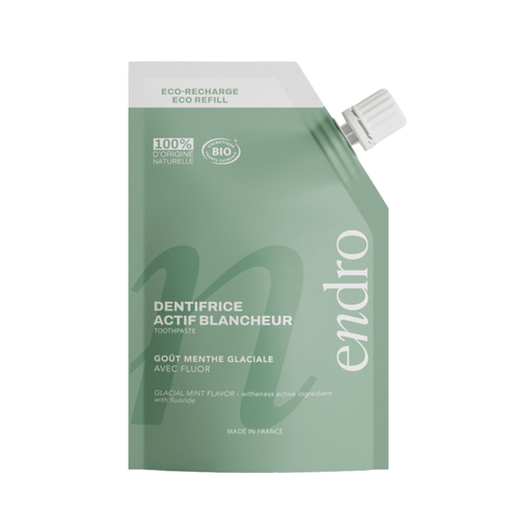 Le Dentifrice Actif Blancheur au Fluor de la marque Endro présente une texture gel légère et une mousse douce qui il procure une sensation de fraîcheur intense grâce à son arôme naturel de menthe glaciale. Conditionné dans un flacon en aluminium 100 % recyclable et rechargeable, ce format est à la fois pratique, économique et respectueux de l’environnement.
