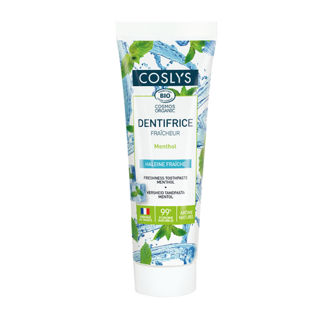 Le Dentifrice Bio Fraîcheur Menthol de la marque Coslys, enrichi en menthe poivrée et en aloe vera, il nettoie les dents en douceur et laisse une haleine fraîche.