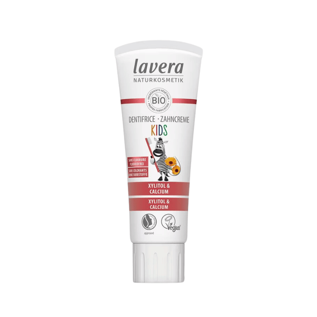Le Dentifrice Kids Sans Fluorure de Lavera protège naturellement les dents de lait avec une formule sans fluorure, ni colorants. Il prévient les caries, élimine la plaque dentaire et protège contre le tartre. Sa texture douce et son goût fruité conviennent aux enfants. Formulé avec du xylitol et du calcium, il est certifié vegan, NATRUE et PETA, et son tube est fabriqué à 50% de plastique recyclé.