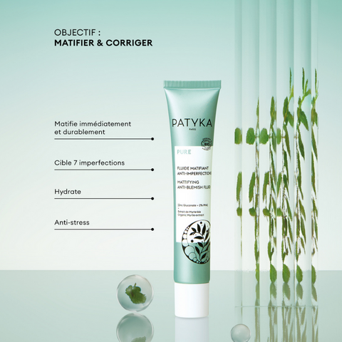Le Fluide Matifiant Anti-Imperfections de Patyka hydrate en légèreté, matifie et réduit les imperfections et les irrégularités du teint.