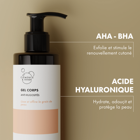 Grâce à sa formule experte alliant AHA et BHA, ce gel exfoliant sans rinçage élimine en douceur les cellules mortes, affine le grain de peau et atténue les rugosités. Il favorise le renouvellement cellulaire pour une peau plus lisse, désincruste et purifie les zones sujettes aux irrégularités. Pour compléter l’action exfoliante, le Gel Corps Anti-Rugosités de la marque Clémence & Vivien apporte une hydratation durable et un effet repulpant, laissant la peau douce, souple et confortable.
