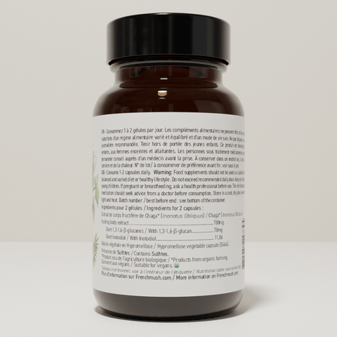700mg d'extraits de corps fructifère (fruiting body) de Chaga* (Inonotus Obliquus), dont au moins 10% de bêta-glucanes.
