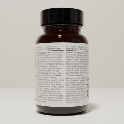Les Gélules d'Extrait Complexe 5 Champignons de la marque French Mush sont faciles à avaler et s’intègrent facilement à votre routine, à raison de 2 à 4 gélules par jour le matin.