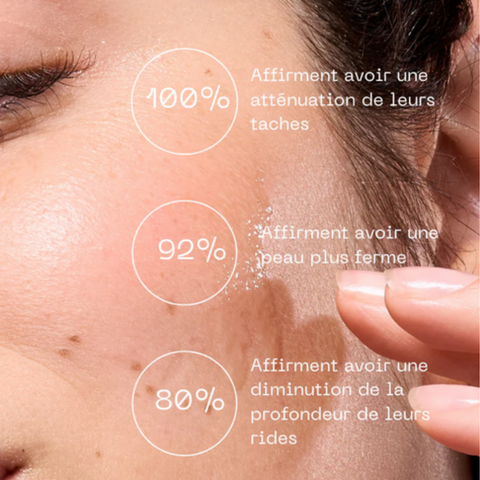 Résultats scientifiquement prouvés dès 28 jours : -29 % d’intensité des taches, 80 % voient leurs rides s’atténuer