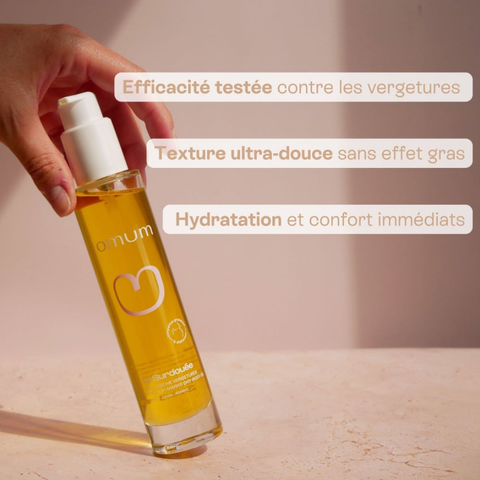 Découvrez l’Huile Sèche Vergetures - La Surdouée de Omum, un soin bio incontournable pour prévenir et atténuer les vergetures tout au long de la maternité. Ce soin précieux, pensé pour accompagner la peau dans ses transformations, nourrit, assouplit et protège intensément les zones sujettes aux étirements. Sa texture sèche et non grasse pénètre rapidement, enveloppant votre peau d’un délicat parfum d’amande, pour une sensation de confort immédiate.