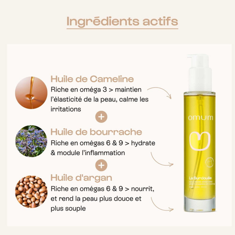 SESAMUM INDICUM (SESAME) SEED OIL*, SIMMONDSIA CHINENSIS (JOJOBA) SEED OIL*, PRUNUS DOMESTICA SEED OIL*, PRUNUS ARMENIACA (APRICOT) KERNEL OIL*, ALOE BARBADENSIS LEAF JUICE POWDER*, ARGANIA SPINOSA KERNEL OIL*, OENOTHERA BIENNIS (EVENING PRIMROSE) OIL*, CAMELINA SATIVA SEED OIL*, BORAGO OFFICINALIS SEED OIL*, CARTHAMUS TINCTORIUS (SAFFLOWER) SEED OIL*, TOCOPHEROL, GLYCINE SOJA (SOYBEAN) OIL. * Ingrédients issus de l’Agriculture Biologique - Ingredients from Organic Farming.