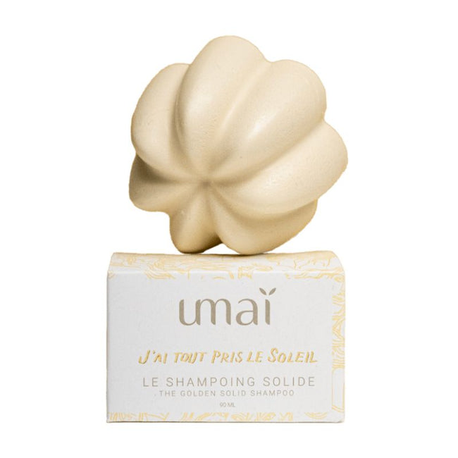 Le shampoing solide Après-soleil Umaï contient 2 à 3 fois moins d’ingrédients qu’un shampoing classique tout en affichant une durée de vie plus longue (35 à 40 lavages).
