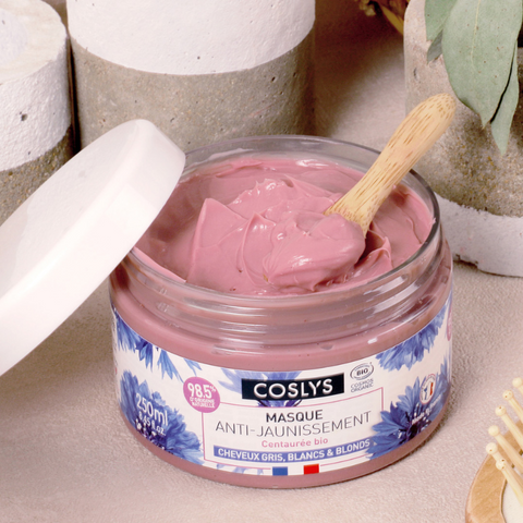 Vous avez les cheveux blancs, gris ou blonds et vous redoutez les reflets jaunes ? On a ce qu’il vous faut : le Masque Bio Anti-Jaunissement de la marque Coslys ! Formulé avec du beurre de karité, de l’aloe vera et de la centaurée bio, il neutralise les reflets jaunes, nourrit et hydrate les cheveux.