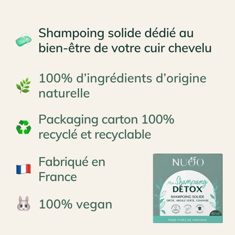 > Le Shampoing Détox ( format vente ) : un soin solide naturel, vegan, et made in France. Idéal pour les cheveux à tendance grasse, ternes ou fins, il nettoie en douceur et régule le sébum grâce à la poudre d'orties, l'argile verte et l'huile de chanvre. Sa mousse riche apporte brillance et volume, avec un parfum vivifiant de menthe marocaine, basilic et thé vert.