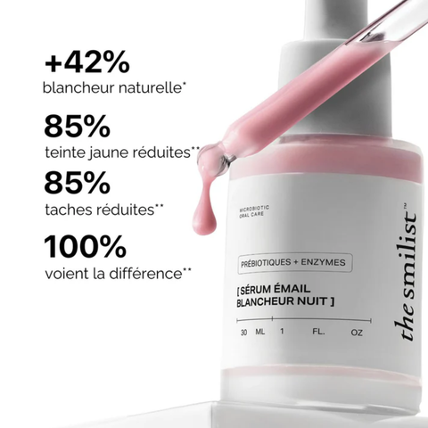 Le Sérum Émail Blancheur Nuit de la marque The Smilist est un soin nocturne innovant conçu pour raviver la blancheur naturelle des dents et renforcer l’émail, idéal pour tous les sourires sujets aux taches superficielles.
