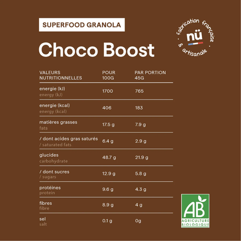 Riche en fibres, magnésium et phosphore, Choco Boost est un véritable boost d’énergie pour bien démarrer la journée. Sa texture croustillante et fondante et son goût chocolaté intense en font une alternative saine et réconfortante pour le petit-déjeuner ou les petites faims.