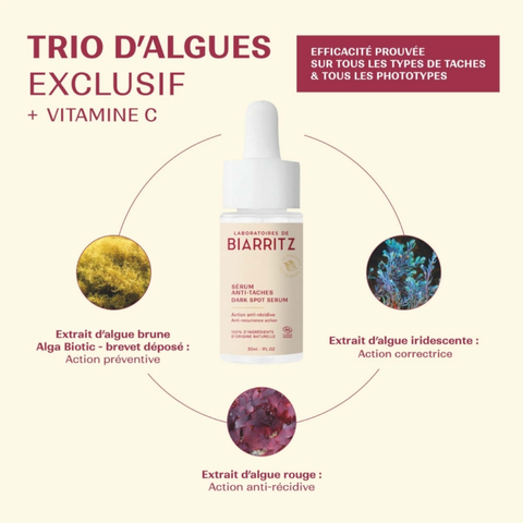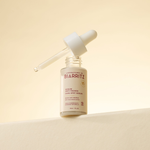 Le Sérum Anti-Taches des Laboratoires de Biarritz est un soin haute efficacité qui corrige vos taches pigmentaire en douceur. Adapté à tous les types de peau, même les plus sensibles.