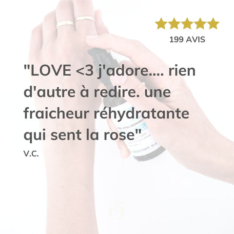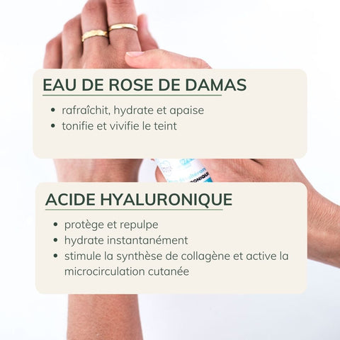 INCI : rosa damascena flower water (hydrolat de rose)*, glycerin*, erythritol, sodium hyaluronate (acide hyaluronique), benzyl alcohol, dehydroacetic acid, aqua ,benzyl alcohol**, citronellol**, geraniol** Hydrolat de rose de Damas, Glycérine, erythritol, acide hyaluronique,