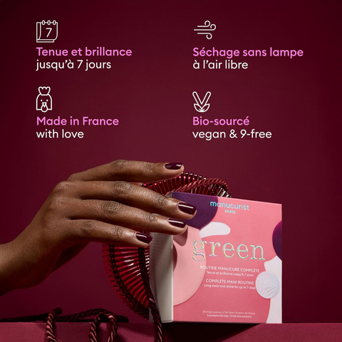 Parfait !!!CCatherine S.Système Green - coffret de NoelSuperbe gamme, j’ai été agréablement surprise de la tenue de mon vernis. presque 2 semaines au total donc plus des 7 jours indiqués dans les détails du produit. ! Sans compter le temps de séchage qui est rapide. La couleur est très jolie, simple et original de par sa brillance.
