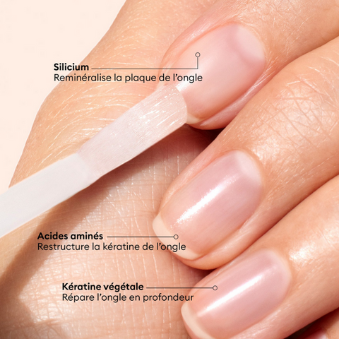 Sa formule à 68,5 % d’ingrédients d’origine naturelle associe dimethylsulfone, silicium et kératine végétale pour restaurer la plaque de l’ongle et favoriser une croissance saine. Les acides aminés participent à restructurer et densifier le réseau de kératine, tandis que le dimethylsulfone aide à durcir l’ongle. Le silicium reminéralise et restructure, et la kératine végétale répare en profondeur.