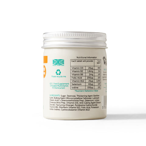 INCI : Sucre, Dextrose, Thickening agent (Xantham Gum), Bulking Agent (Microcrystalline Cellulose), Lubricant Cholecalciferol Prep (Vitamine D3), Caking Agent (Silicon Dioxide), Flavouring, Pyridoxine Hydrochloride (B6), Riboflavin (B2), Folic Acid, Potassium Iodide (Iodine), Cyanocobalamin (B12).