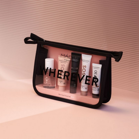 Les textures sont légères et agréables, faciles à appliquer en toutes circonstances. Le Coffret Wherever Kit de Voyage 5-en-1 de la marque Mádara présente ses soins en format pratique pour le voyage, avec flacons compacts et dosage précis, aux parfum subtil et naturel.